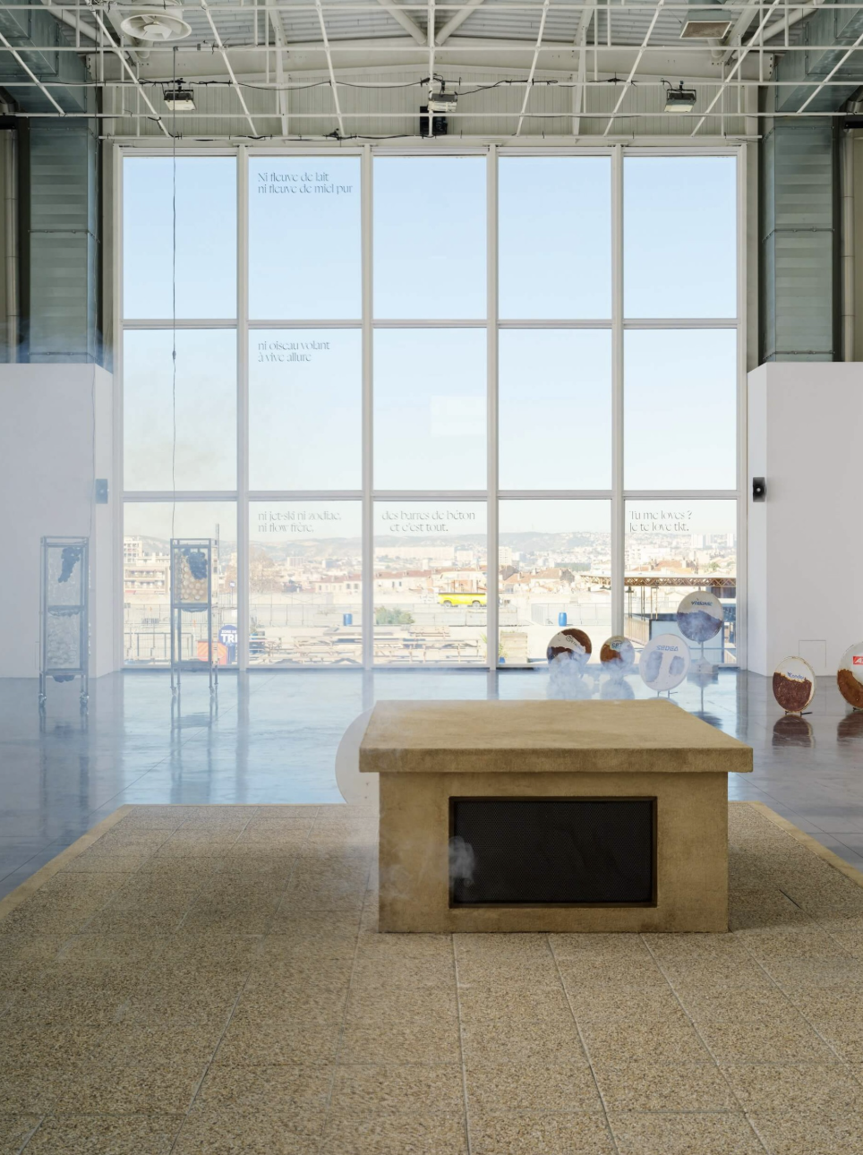 Broadcast throughout the exhibition on two visible speakers, made for public spaces, the sound installation The Site of Sound was recorded on cassette in Marseille in 2023, during the successive riots following the death of Nahel Merzouk.