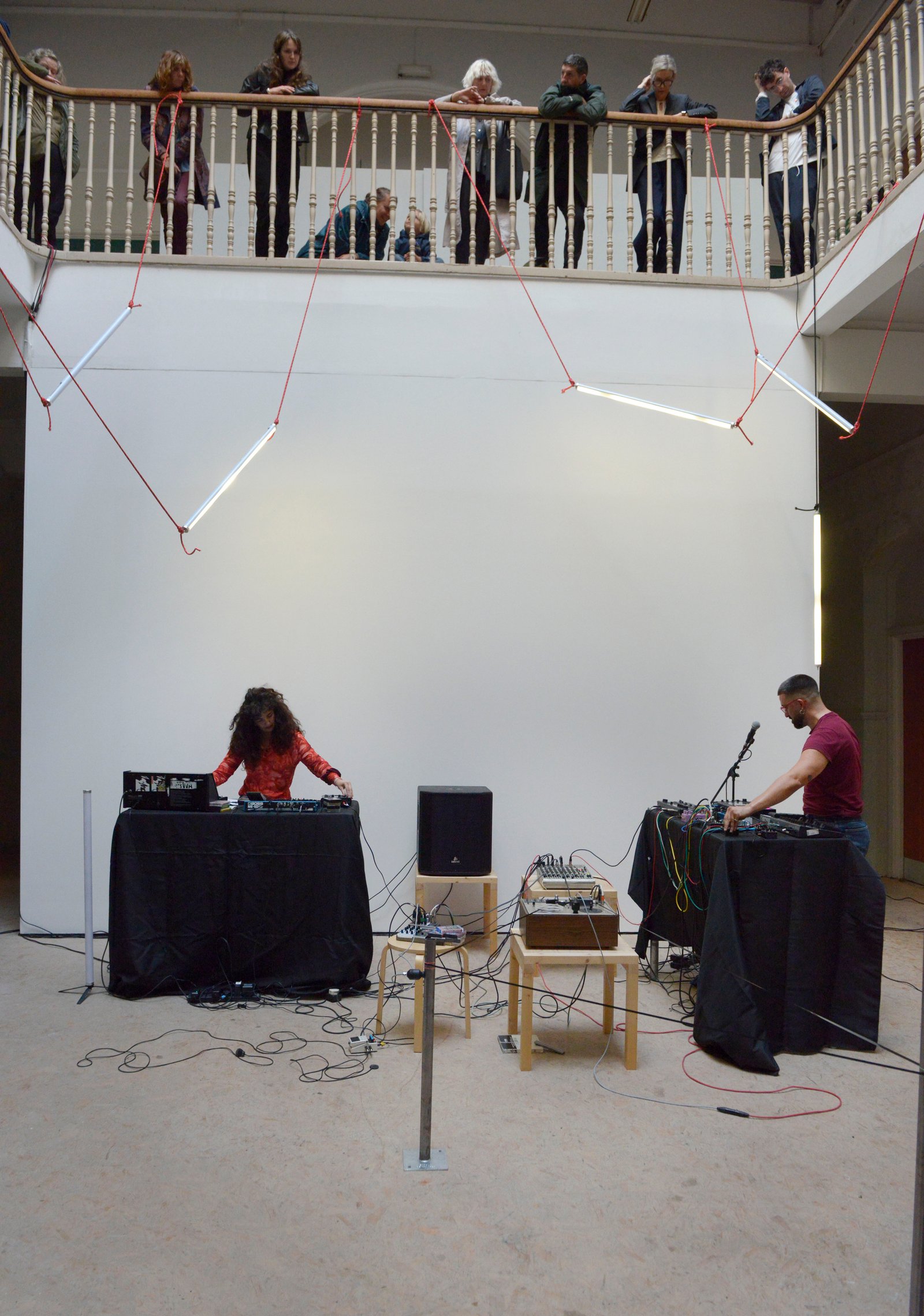 Working with analogue equipment - specifically elongated reel-to-reel tape loops that are stretched through the space - Jones builds a multilayered soundscape that rhythmically returns, drops out and repeats on itself. Using contact microphones, Kennedy samples sounds made by the body in motion. In recurrent movements, and choreographic abstraction, Kennedy builds bodily narratives and an emotional progression that eventually reaches exhaustion. Together, the pair develop a cyclical exchange between sound and choreography, relaying back and forth within sonic space.