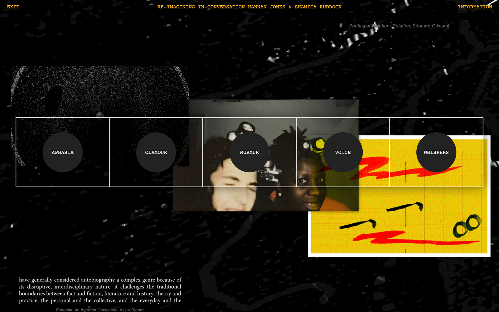 Through sonics, spatial dynamics, and world-building, Jones and Ruddock reimagine the ‘in-conversation.’ This iteration assembles sound, visual cues, research, and scores, grounded in the core text Female Voices in Revolution: Autobiography and Collective Memory in Assia Djebar’s Fantasia: An Algerian Cavalcade and Merle Collins’s Angel, an essay by Koichi Hagimoto exploring the orality of Algeria in relation to Caribbean oral traditions.